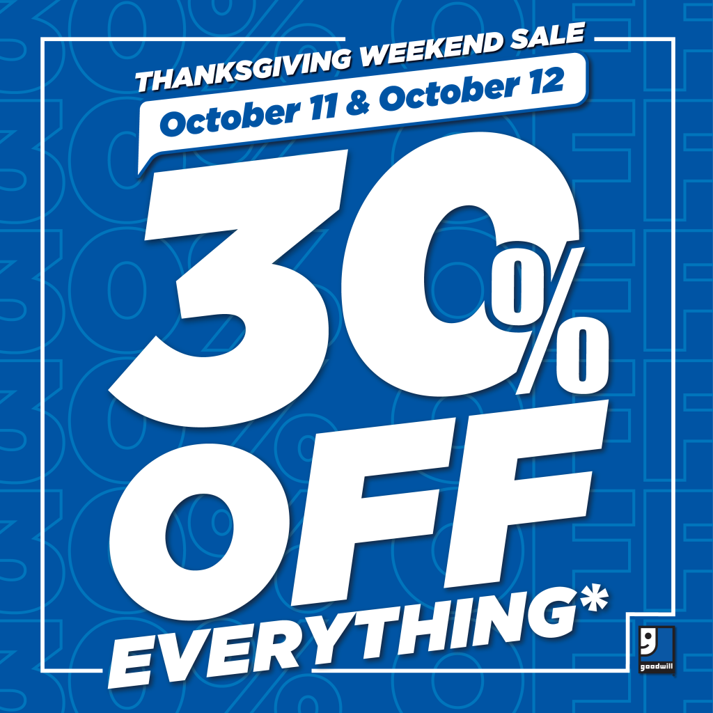 Sale valid in-store at Goodwill Industries, Ontario Great Lakes Community Stores, Bookstores and Boutique locations on Friday, October 11 and Saturday, October 12, 2024.