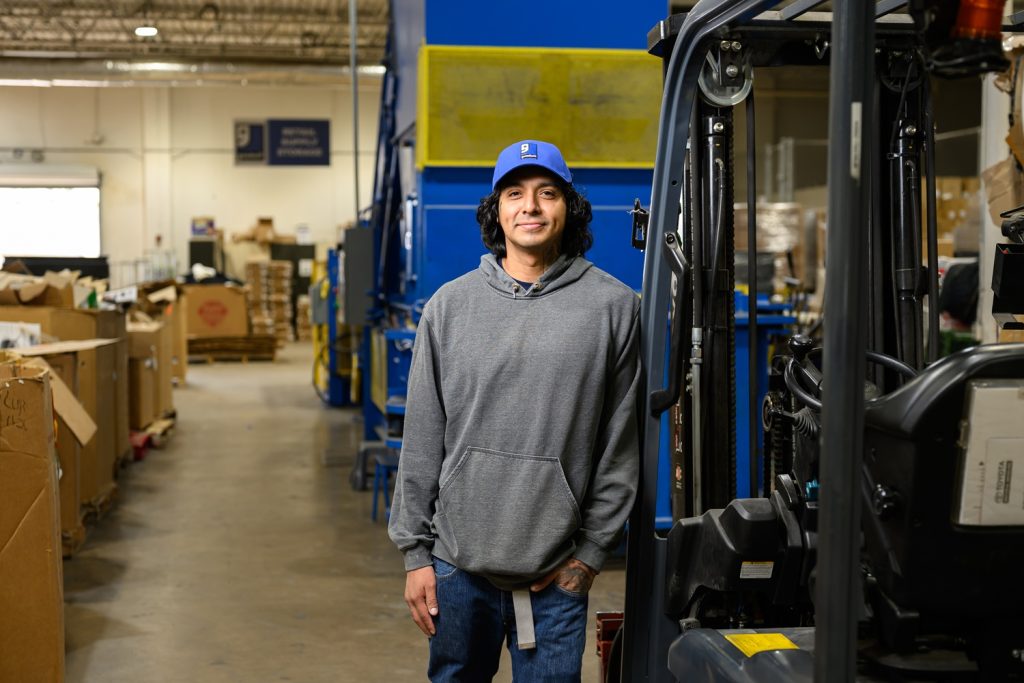 A young man in a grey long-sleeve shirt and blue baseball cap stands next to a forklift in a warehouse.