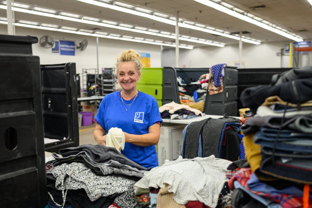 A woman in a blue Goodwill t-shirt sorts clothes at a donation centre.