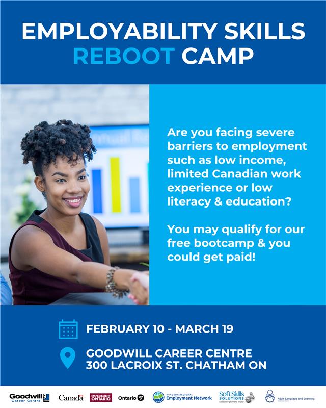 Are you ready to unlock the skills and confidence you need to achieve your employment goals? The Chatham Goodwill Career Centre, in partnership with Adult Language and Learning Chatham, is proud to host the Employability Skills Reboot Camp!