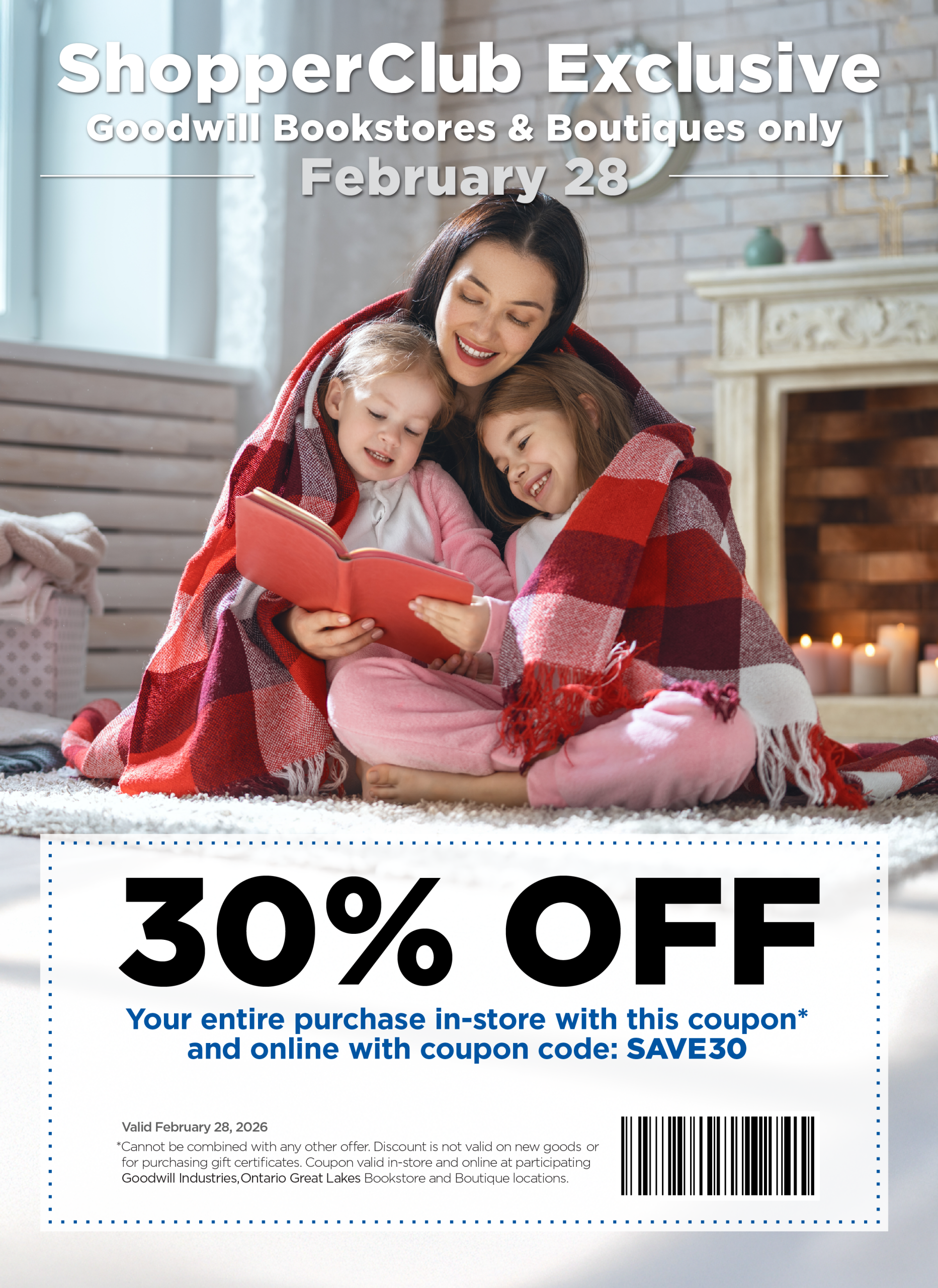 Goodwill 30% off ShopperClub sale is valid in-store and online at Goodwill Bookstores and Boutique locations on February 28, 2026, with this coupon!