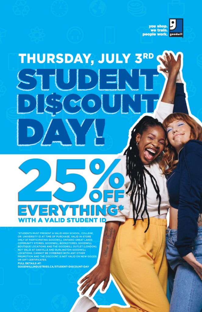 Present your valid high school, college, or university student card at participating Goodwill Industries Ontario Great Lakes Community Store, Bookstore, Boutique location, or the Goodwill Outlet (London) to receive 25% off* your entire purchase on Thursday, December 4, 2025!