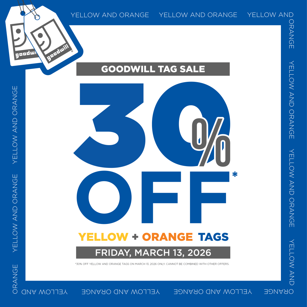 Join us in-store for 50% off yellow-tagged items and orange-tagged items on Friday, January 23rd, 2026. Sale valid in-store at participating Goodwill Industries, Ontario Great Lakes Community Stores only.